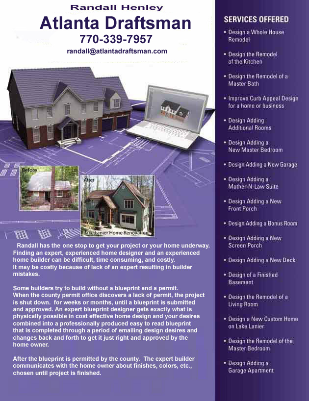 -I can save you thousands of dollars on getting your residential design, working drawings for construction, and building permits in Alabama, Georgia, North Carolina, South Carolina & Florida.